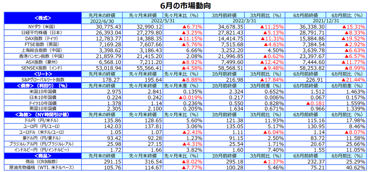6月の主要国の株式市場は中国市場を除き軟調な展開となりました。米国株式市場は、インフレ抑制のため米連邦準備制度理事会(FRB)が大幅な利上げを行ったことや、世界の中央銀行が相次いで利上げを実施し、先行きの景気減速観測が強まったことを嫌気して大きく下落しました。欧州の株式市場は、欧州中央銀行(ECB)の利上げ加速観測が高まり、景気減速懸念が強まったことから大幅安となりました。日本の株式市場も、世界景気の減速懸念や欧米株式市場の下落を受けて調整しました。一方、中国株式市場は、上海のロックダウン解除や中国政府の景気対策期待から、上海総合指数、香港ハンセン指数ともに上昇しました。 |