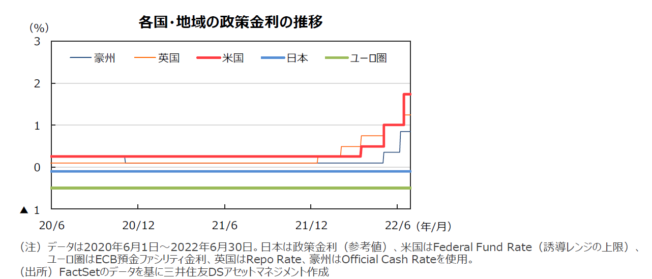 FRBは、6月の米連邦公開市場委員会(FOMC)でフェデラルファンド(FF)金利の誘導目標を0.75~1.00から1.50~1.75%へ、0.75%引き上げました。また、FOMC参加者による2022年末時点の政策金利見通しは、中央値が3.375%に切り上がりました。パウエル議長は記者会見で、7月の会合でも0.5~0.75%の利上げの可能性を示唆しました。ECBは6月の理事会で、主要政策金利を据え置く一方、量的緩和政策を7月1日に終了することを決めました。また、7月に0.25%の利上げに踏み切ることを声明文に明記しました。日銀は6月の金融政策決定会合で、大規模な金融緩和策を維持しました。声明文で為替市場を注視すると明記しました。