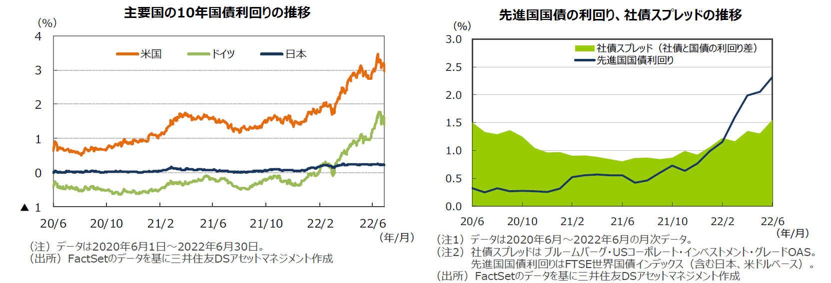 米国の10年国債利回り(長期金利)は、5月の米消費者物価上昇率が約40年ぶりの高水準となり、FRBがより積極的に金融引き締めを行うとの観測が強まったことから、月半ばにかけて大幅に上昇しました。米長期金利は一時3.4%台と、2011年4月以来の高水準を付けました。しかし、FRBがFOMCで0.75%の利上げを決めると、会合後は持ち高調整の債券買いが優勢となり、低下に転じました。その後世界の中央銀行の利上げが相次ぎ、グローバルな景気減速懸念が高まったため、米長期金利は月末にかけて低下し、月間の上げ幅を縮めました。ドイツの長期金利は、ECBが理事会で7月に政策金利を0.25%引き上げ、9月も利上げを継続する見通しを示したことを受けて、大きく上昇しました。日本の長期金利は、日銀の連続指し値買いオペにより小幅に低下しました。投資適格社債については、景気減速懸念で国債と社債の利回り格差が拡大しました。
