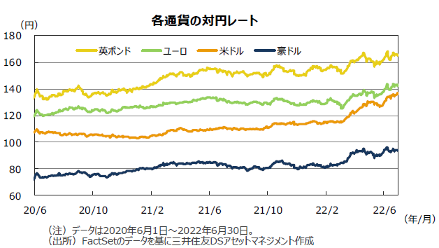 6月の円相場は多くの通貨に対し下落しました。FRBがインフレ抑制を重視して積極的な金融引き締めを続けるとの見方から、先行きの日米金利差の拡大を意識した円売り・ドル買いが優勢となり、月末にかけて円は対ドルで一時1ドル=137円台と、1998年以来およそ24年ぶりの円安・ドル高水準を付けました。円は135円台後半で終了し、月間で約7円の大幅な円安となりました。円は対ユーロでも、金融政策の方向性の違いから大きく値を下げ、前月末の137円台から142円台に下落しました。また、円は資国通貨とされる豪ドルに対して、前月末の92円台から93円台へ下落しました。