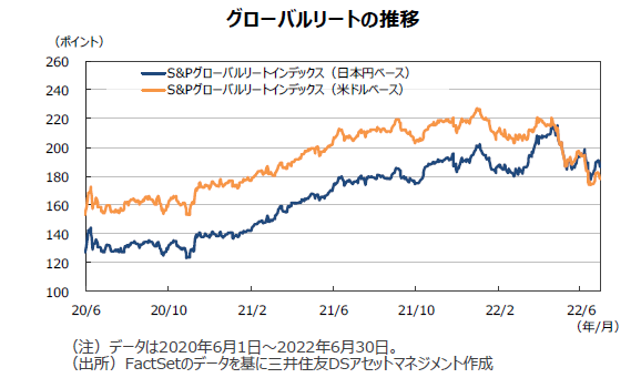 6月のグローバルリート市場(米ドルベース)は大幅に下落しました。FRBがインフレ抑制のため金融引き締めを加速するなか、米長期金利が上昇したことや、先行きの景気減速による物件の解約や賃料の下落懸念から米国リートは大きく下落しました。また、ECBの利上げ観測やウクライナ情勢を嫌気した投資家のリスク回避姿勢から、英国や欧州のリート市場も下落しました。S&Pグローバルリート指数(米ドルベース)のリターンは前月末比▲8.9%となりました。また、為替効果がプラスに寄与し、円ベースは同▲3.8%となりました。