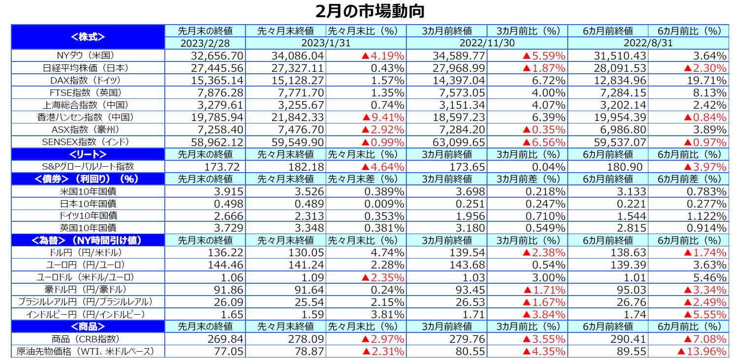 2月の主要国の株式市場は高安まちまちとなりました。米国株式市場は、堅調な景気とインフレの高止まりを背景に米連邦準備制度理事会(FRB)の利上げ停止が遠のくとの見方が強まったことを嫌気して下落しました。一方、欧州の株式市場は、域内のエネルギー不安が後退したことや、中国がゼロコロナ政策を終了したことを受けた景気回復期待から上昇しました。日本の株式市場は膠着感の強い動きとなるなか、円安が進んだことに伴う業績改善期待などから小幅高となりました。中国株式市場では、中国の気球撃墜をめぐる米中関係の悪化懸念や米長期金利上昇による資金流出懸念などから、香港ハンセン指数が大きく下落しました。 |