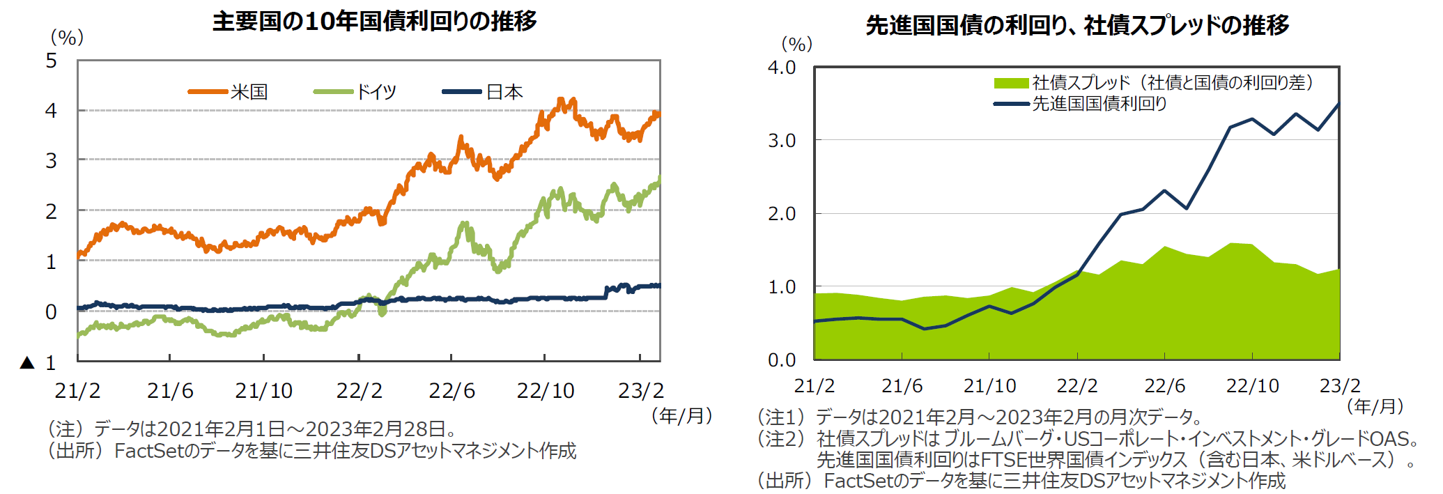 欧米の債券市場は、堅調な景気とインフレ高止まりによる米国の利上げ停止観測の後退から軟調な展開となり、10年国債利回り(長期金利)が大きく上昇しました。米国の長期金利は、2月1日のFOMCを受け、FRBの利上げ終了が近いとの見方が強まり、3.4%程度に低下して始まりました。しかし、米雇用統計で雇用者数が市場予想を大幅に上回ったことを受けて、上昇に転じました。さらに米消費者物価指数などの経済指標が市場予想以上に堅調だったため、利上げ停止観測が後退し、3.9%台に大きく上昇しました。ドイツの長期金利も、米長期金利の上昇に連動し、大きく上昇しました。一方、日本の長期金利は、日銀の金融緩和の修正観測から、長期金利の許容レンジ上限近くでもみ合いました。投資適格社債については、国債と社債の利回り格差が小幅に拡大しました。
