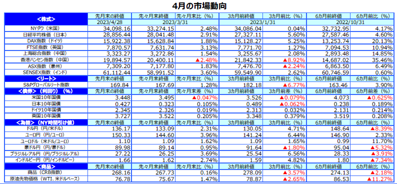 4月の米国株式市場は地方銀行の経営不安や景気後退懸念が燻るなか、ハイテク大手の好業績などに支えられ上昇しました。NYダウは前月比+2.5%、S&P500種指数は同+1.5%、NASDAQ総合指数は同+0.0%でした。日本株式市場は、米国株式市場が上昇したこと、日銀が金融緩和策を維持したこと、金融政策のレビューを1年~1年半かけて行うことになり円安ドル高が進んだこと、などから堅調となりました。日経平均株価は前月比+2.9%、TOPIXは同+2.7%でした。