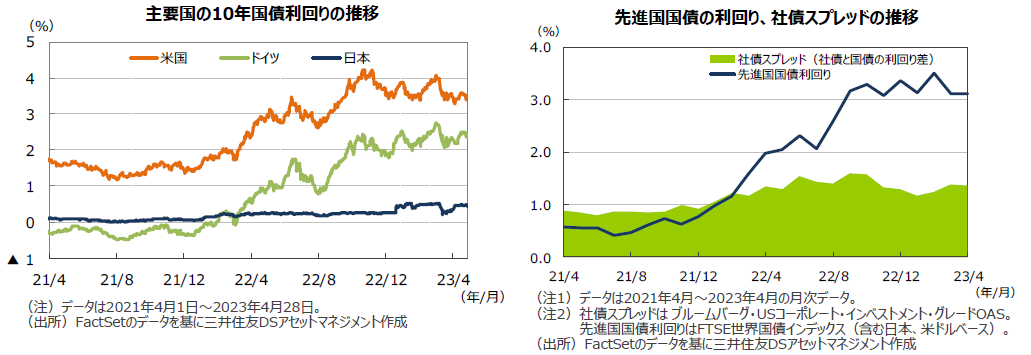 主要国の債券市場は、レンジ内でもみ合う展開となり、10年国債利回り(長期金利)は前月比まちまちとなりました。米国の長期金利は、景気減速とFRBの利上げ停止が意識されるなか、小幅に低下しました。4月7日発表の雇用統計を受けて米景気に対する過度な下振れ懸念が薄れ、一時3.6%まで上昇しましたが、米景況感の悪化を示す指標を受けて、3.4%台に低下して終了しました。ドイツの長期金利は、好調な経済指標を受けて、ECBが利上げを継続するとの見方から上昇しました。日本の長期金利は、日銀による政策修正観測から上昇しました。ただし、月末の金融政策決定会合を受けて、早期の政策修正観測が後退したことから、上昇幅を縮めました。投資適格社債については、国債と社債の利回り格差が小幅に縮小しました。