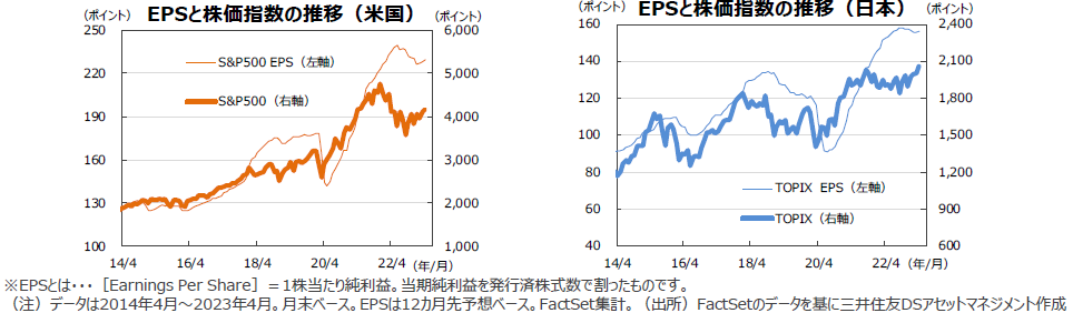 S&P500種指数採用企業の23年1-3月期の増益率(純利益ベース)は前年同期比▲1.9%、除くエネルギーセクターで同▲3.5%の見通しです(4月28日。リフィニティブ集計)。一方、TOPIX採用企業の23年1-3月期の純利益は前年同期比+78.9%、22年度(22年4月~23年3月)は前年度比+18.0%の見通しです(5月2日。3月期決算企業で除く金融、QUICK集計)。