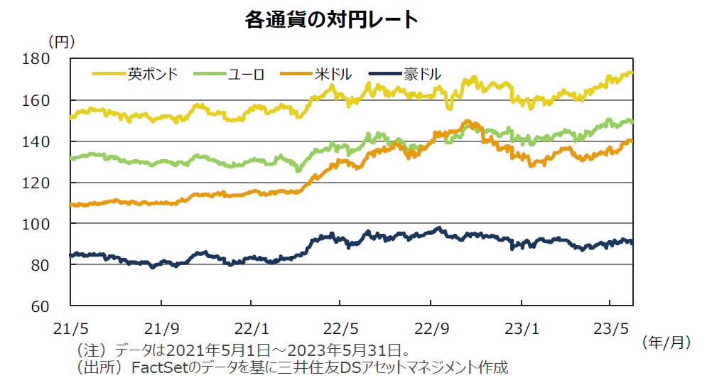 円相場は米ドルに対し、月前半はもみ合いましたが、月下旬に半年ぶりの安値となる140円台まで下落し、月末は139円台で終了しました。堅調な雇用指標やFRB高官のタカ派発言を受けて、FRBの利上げが続くとの見方が強まり、米長期金利が上昇したことから日米金利差の拡大を意識した円売り・ドル買いが優勢となりました。一方、円の対ユーロレートは、1ユーロ=149円近辺で終了し、前月から上昇しました。米長期金利の上昇による欧米金利差の拡大でユーロ売り・ドル買いが強まり、ユーロが米ドルに対し円以上に下落したことが背景です。また、円は対豪ドルで、豪州準備銀行が予想外に利上げを実施したことを受けて、小幅に下落しました。