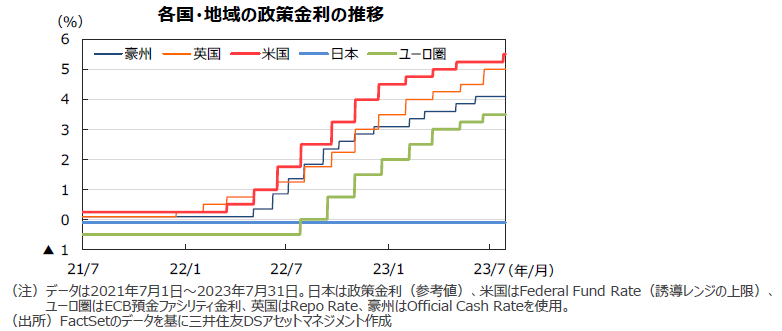 米連邦準備制度理事会(FRB)は、7月の米連邦公開市場委員会(FOMC)で、フェデラルファンド(FF)金利の誘導目標を5.00~5.25%から5.25~5.50%に0.25%引き上げました。パウエル議長は記者会見で、今後の金融政策判断は「データ次第」と従来通りの姿勢を示しました。ECBは7月の理事会で、9会合連続となる利上げを決めました。利上げ幅は3会合連続で0.25%でした。ラガルド総裁は記者会見で、今後の利上げペースは「データ次第」とし、9月の利上げ見送りの可能性に言及しました。日銀は、7月の金融政策決定会合で、YCCの運用を柔軟化しました。長期金利の上限について0.5%を「目途」として、0.5%を超える金利上昇を容認しつつ、事実上1.0%の上限を設けました。大規模な金融緩和策の枠組みは維持しました。
