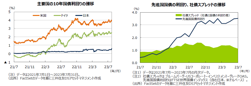 日米欧の債券市場は下落し、10年国債利回り(長期金利)が上昇しました。米国の長期金利は、雇用統計で平均時給が市場予想以上に伸びたことを受けて、月上旬に4.0%台に上昇しました。その後は米消費者物価指数(CPI)が市場予想を下回り、インフレが鈍化傾向を示したことなどからやや低下してもみ合いました。月末は3.9%台で終了し、前月から上昇しました。ドイツの長期金利は、米長期金利に連動して上昇しました。日本の長期金利は、日銀が金融政策決定会合でYCC運用を柔軟化し、長期金利について0.5%を上回る水準を容認したことを受けて、大きく上昇しました。また、投資適格社債については、堅調な株式市場を受けて国債と社債の利回り格差が縮小しました。