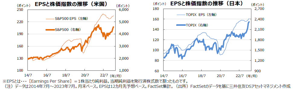 S&P500種指数採用企業の増益率(純利益ベース)は4-6月期が前年同期比▲6.4%(除くエネルギーセクターで同▲0.3%)ですが、7-9月以降は増益転換が予想されています(7月28日。リフィニティブ集計)。7-9月以降の見通しを先月と比べると、全体では小幅な下方修正ですが、除くエネルギーセクターベースではむしろ小幅な上方修正となっています。一方、TOPIX採用企業の23年4-6月期の純利益は前年同期比+42.5%と予想されており、好調を維持しそうです(8月1日。3月期決算企業で除く金融、QUICK集計)。