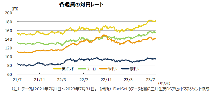 円相場は、日銀によるYCC修正を受けて、振れが大きい展開となりましたが、主要通貨に対し前月比でやや上昇しました。ただ、日銀が今後も大規模な金融緩和を続けるとの見方から、円の上昇幅は限られました。円の対米ドルレートは、米国の物価指標が鈍化傾向を示したことでFRBの利上げ打ち止め観測が高まったことや、日銀が金融政策決定会合でYCCの修正を行ったことを受けて、上下に振れたものの、月末は142円台と、前月末の144円台から上昇して終了しました。円の対ユーロレートも、前月末の157円台からやや上昇し、156円台で終了しました。また、円の対豪ドルレートも、日銀がYCCの柔軟化を実施したことなどを受けて、小幅に上昇しました。