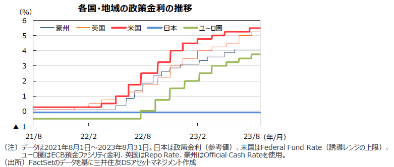 FRBは、7月の米連邦公開市場委員会(FOMC)で、フェデラルファンド(FF)金利の誘導目標を5.00~5.25%から5.25~5.50%に0.25%引き上げました。パウエル議長は8月の「ジャクソンホール会議」で、金融政策判断は「データ次第」と改めて強調しました。欧州中央銀行(ECB)は7月の理事会で、9会合連続となる利上げを決めました。利上げ幅は3会合連続で0.25%でした。ラガルド総裁は記者会見で、今後の利上げペースは「データ次第」とし、9月の利上げ見送りの可能性に言及しました。日銀は、7月の金融政策決定会合で、長短金利操作(イールドカーブ・コントロール、YCC)の運用を柔軟化し、長期金利について事実上1.0%の上限を設けて0.5%を上回る水準を容認しました。大規模な金融緩和策の枠組みは維持しました。
