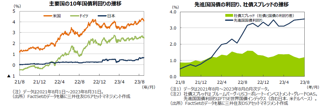 米国の10年国債利回り(長期金利)は、根強いインフレ圧力や米国債の需給悪化懸念により月初から上昇しました。堅調な米景気を示す経済指標の発表が相次ぐなか、FRBによる金融引き締めが長期化するとの観測から一時4.3%台まで上昇しました。しかし、月下旬に開催された「ジャクソンホール会議」で、パウエルFRB議長が従来のデータ重視の考えを強調したことを受け、長期金利は低下に転じ、月末は4.1%割れで終了しました。ドイツの長期金利は、ユーロ圏の景況感の悪化を受けて、小幅に低下しました。日本の長期金利は、米長期金利に連動して上昇しました。また、投資適格社債については、株式市場の下落を受けて国債と社債の利回り格差が拡大しました。