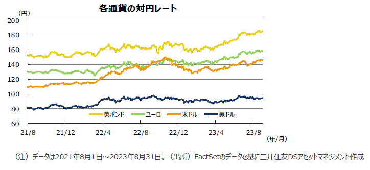 円の対米ドルレートは、下落傾向が続きました。FRBの金融引き締めが長引くとの見方から米金利が上昇したことを受けて、日米の金利差拡大を意識した円売り・ドル買いが強まりました。月下旬の「ジャクソンホール会議」では、パウエルFRB議長は金融引き締めを継続する姿勢を示した一方、日銀は金融緩和を続けていることから、金融政策の方向性の違いが改めて着目され、円は一時147円台と昨年11月以来の安値を付けました。月末は145円半ばで終了しました。円の対ユーロレートは、前月末の156円半ばから下落し、158円近辺で終了しました。一方、円の対豪ドルレートは、豪州経済と結びつきの強い中国景気の減速懸念から、小幅に上昇しました。