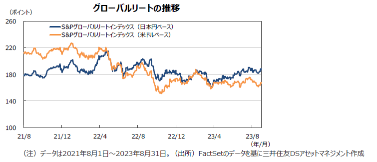 グローバルリート市場(米ドルベース)は、FRBによる金融引き締めが長期化するとの観測から米国の長期金利が上昇したことや、中国経済の減速懸念を嫌気して、下落しました。米国リート市場は、堅調な米景気を示す経済指標の発表が相次ぐなか、米長期金利が上昇したことや、株式市場が調整したことを受けて下落しました。欧州やアジアのリート市場は、中国経済の減速懸念を受けて、軟調な展開となりました。一方、日本リート市場は、7月の日銀によるYCCの修正後、長期金利の上昇幅が限られたことなどを受けて、上昇しました。S&Pグローバルリート指数(米ドルベース)のリターンは前月末比▲3.4%となりました。また、為替効果がプラスに寄与し、円ベースのリターンは同▲1.0%となりました。