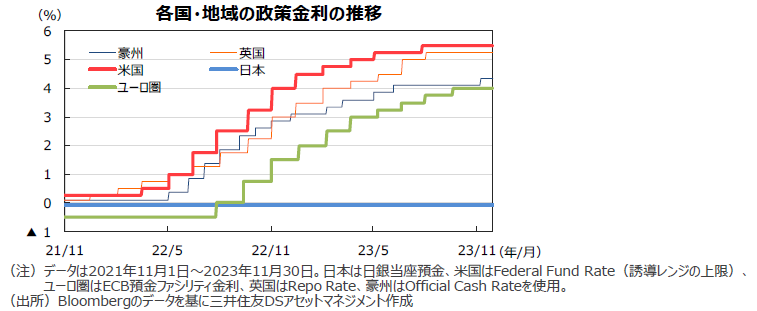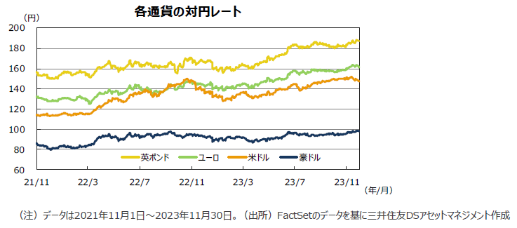 11月の主要国の株式市場は、世界的に長期金利が大きく低下したことを受けて、投資家のリスク選好姿勢が強まったことから、中国を除き上昇しました。米国株式市場は、米連邦準備制度理事会(FRB)による利上げ局面が終了したとの見方が強まり、米長期金利が大幅に低下したことを好感して、大きく上昇しました。欧州の株式市場も、長期金利が低下するなか、米国株の上昇を受け、堅調な展開となりました。日本の株式市場も、日本企業の決算が好調なことや、米長期金利の急低下に伴いハイテク株などに買い戻しが入ったことから、大幅な上昇となりました。一方、中国株式市場は、景気対策期待が下支えとなったものの、中国不動産市場の低迷による景気減速懸念などから上値が重く、上海総合指数、香港ハンセン指数ともにほぼ横ばいでした。