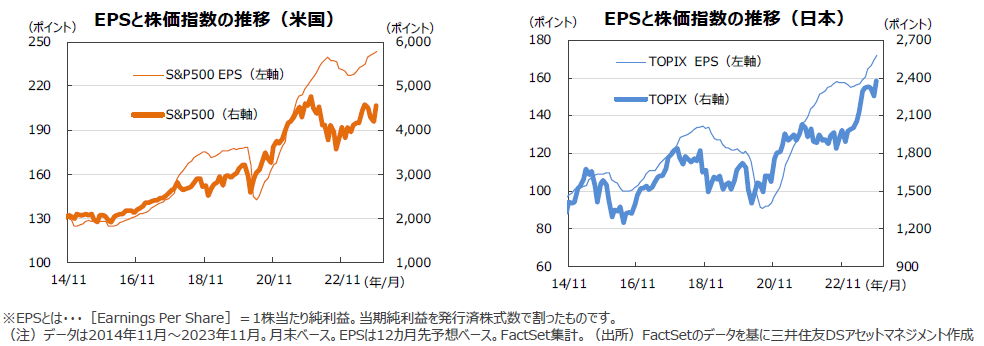 ●S&P500種指数の11月の予想1株当たり利益(EPS)は244.0で、3カ月連続で過去最高水準を更新しました。前年同月比は+5.4%、前月比は+0.7%でした。TOPIXの予想EPSは171.7、前年同月比は同+9.0%、前月比は+1.6%と増益基調が続いています。