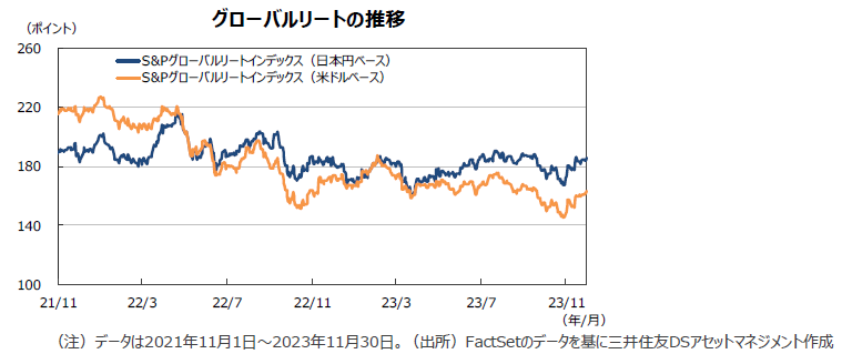●グローバルリート市場は、不動産市況の停滞や長期金利の高止まりから当面振れの大きい展開が見込まれますが、FRBの利上げ局面が終了したとみられるなか、長期金利が低下することに伴い、中期的には回復するとみています。