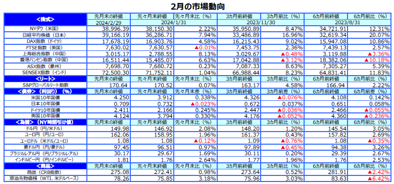 米国の10年国債利回り(長期金利)は、米経済指標が市場の予想以上の強さを示したことや、FRBが早期利下げに慎重であるとの見方が広がったことから上昇しました。ドイツの長期金利は、欧州中央銀行(ECB)の早期利下げ観測が後退したことや、米長期金利が上昇したことを受けて上昇しました。一方、日本の長期金利は、実質GDPが2四半期連続のマイナス成長となり、日銀による早期の金融緩和修正観測が後退したことなどから低下しました。 |
