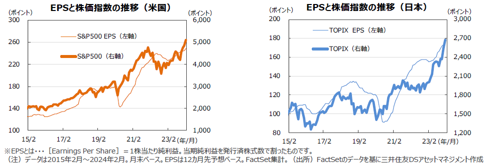 ●米ファクトセット(FactSet)によれば、S&P500種指数の2月の予想1株当たり純利益(EPS)は前年同月比+9.6%となり、6カ月連続で過去最高水準を更新しました。また、TOPIXの2月予想EPSは前年同月比+15.2%となり、9カ月連続で過去最高水準を更新しました。