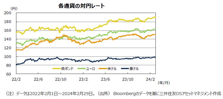 ●円の対米ドルレートは、米景気の堅調さを示す経済指標の発表が続き、FRBによる早期の利下げ観測が後退したことによる米長期金利上昇を受けて下落基調となりました。前月末の147円近辺から月末は150円近辺に下落して終了しました。
