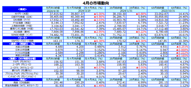 ●米国株式市場は、インフレの根強さを示す経済指標が相次ぎ、FRBの利下げ観測が大きく後退して長期金利が上昇したことから、投資家心理が悪化し、調整しました。NYダウは前月比▲5.0%と、6カ月ぶりの下落となりました。