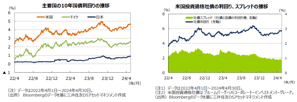 米国の10年国債利回り(長期金利)は、インフレの根強さを示す経済指標が相次ぎ、FRBの利下げ観測が大きく後退したことから大幅に上昇しました。ドイツの長期金利は、欧州中央銀行(ECB)が次回6月の利下げ転換の可能性を示唆したものの、米長期金利に連れて上昇しました。日本の長期金利は、米長期金利の上昇と円安が進行するなか、追加利上げの観測が高まったことから上昇しました。 |