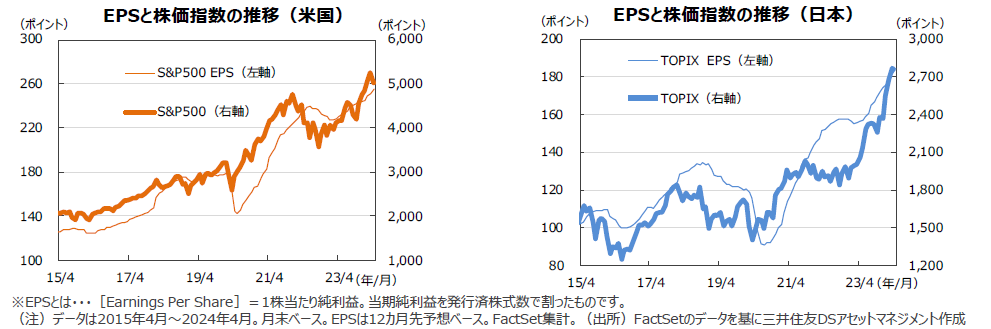 ●ファクトセット(FactSet)によれば、日米の企業業績は過去最高水準を更新しており、堅調です。4月末のS&P500種指数の予想1株当たり純利益(EPS)は前年同月比+10.8%、TOPIXの予想EPSは同+17.6%と、いずれも2桁の伸びとなりました。