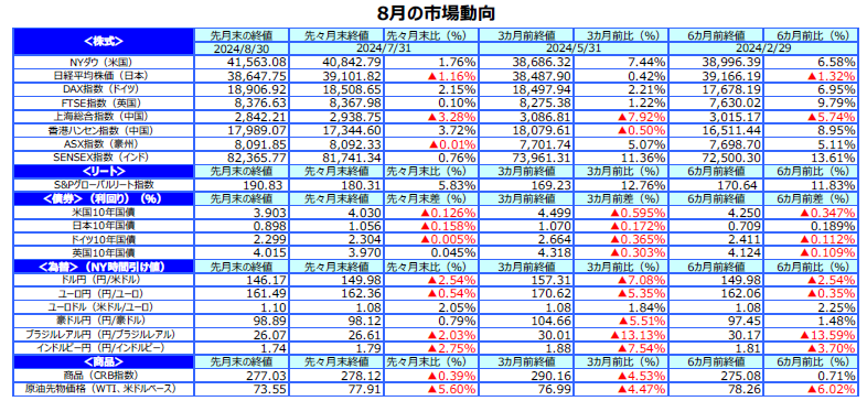 ●米国株式市場は、景気悪化懸念から月初に急落したものの、経済指標の改善やFRBのパウエル議長が9月の利下げを強く示唆し、米景気のソフトランディング期待が高まったことから買い戻しが入り、上昇しました。NYダウは前月比+1.8%、S&P500種指数は同+2.3%の上昇となりました。