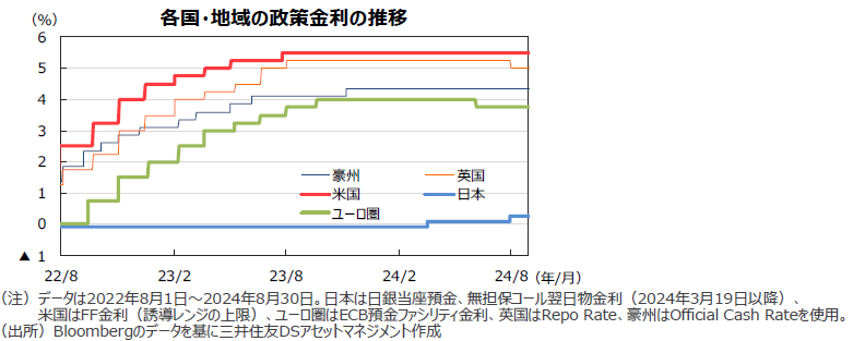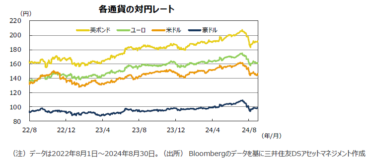 米国の10年国債利回り(長期金利)は、FRBが9月に利下げを開始するとの見方が改めて強まったことから節目の4%を下回り、一時3.8%を割り込む局面を経て、3.9%に低下しました。ドイツの長期金利は、欧州中央銀行(ECB)のラガルド総裁が追加利下げについて慎重な姿勢を崩していないことから、ほぼ横ばいでした。日本の長期金利は、月初の株価急落に伴い急低下した後、株価の持ち直しで低下幅をやや縮めました。 |