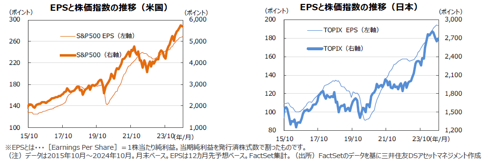 ●米ファクトセット(FactSet)によれば、日米の企業業績は好調を維持しています。10月末の米S&P500種指数の予想1株当たり純利益(EPS)は前年同月比+11.0%、TOPIXの予想EPSは同+14.7%と、いずれも2桁の伸びとなりました。
