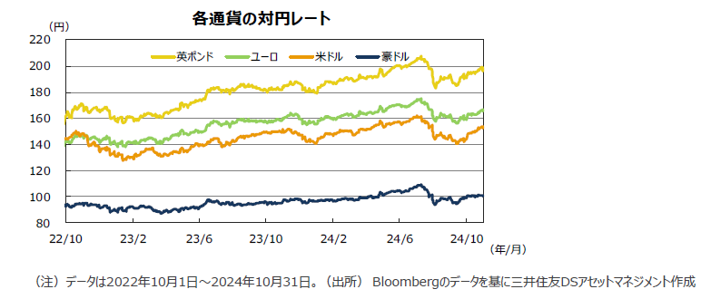 ●円の対米ドルレートは、米長期金利が上昇したことなどを受けて大幅に下落しました。米雇用統計が想定外に強く、米長期金利が上昇したことや衆議院選挙で与党が過半数割れとなり、日銀の追加利上げが遅れるとの見方などから、前月末の143円台半ばから152円近辺に下落しました。