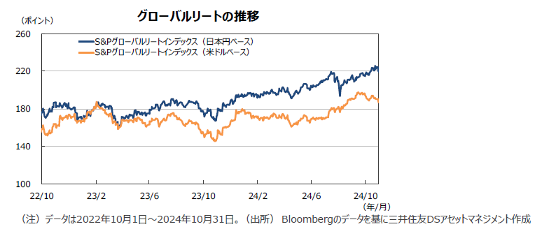 ●グローバルリート市場(米ドルベース)は、米長期金利が大きく上昇したことが嫌気され、大幅安となりました。S&Pグローバルリート指数のリターンは前月末比▲4.6%となりました。一方、円ベースのリターンは、為替効果がプラスに寄与し、同+1.6%となりました。