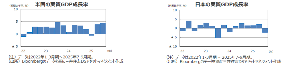 ●米国の25年の実質GDP成長率見通しを+2.0%、26年見通しを+2.1%に上方修正しました。7-9月期の成長率は想定よりも上振れました。政府機関閉鎖の影響で10-12月期の成長は下押しするでしょうが、民間需要や雇用情勢に大きな質的変化はない模様です。26年1-3月期以降は、利下げ、減税効果の発現、政府機関再開に伴う成長加速などで持ち直すことになるでしょう。