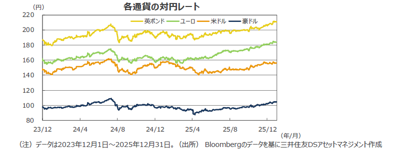 米国で政策金利が引き下げられ、日本では引き上げられましたが、国債売りのキャピタルフライトなどから日本の対外証券投資が増え、円ドルレートはもみ合い状態となりました。欧州では、政策金利の引き下げが一巡したと見られていることや長期金利が全般的に上昇したことから、ユーロはドルに対し底堅い展開となりました。貴金属、非鉄など商品市況が堅調に推移していることを背景に、豪ドルは上昇基調が続きました。
