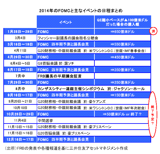 FRBは今後も100億ドルずつQEを縮小し、今秋にも終了させると見られます。金利先物などから見ると、2015年半ばから後半に利上げが開始されると、市場は織り込んでいます。ECBは景気と物価が上向く兆しが無ければ、資産購入などの追加策を導入する可能性があります。日銀は年+2%の物価上昇という目標に向けて量的・質的金融緩和を続けており、緩和策を拡充する可能性もありそうです。