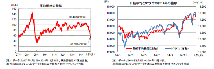 2014年末の原油価格(NY先物)は2013年末のおよそ半値と、大きく下落しました。米国などエネルギーを多く消費する国では、企業や家計の受けるメリットへの期待から株価が上昇し、また期待インフレ率が抑制されて国債の利回り低下の一因となりました。一方、資源国の株式や通貨は下落し、投資家のリスク回避的な動きの拡大から、新興国国債やハイ・イールド債券などの格付けが低い債券の価格が下落しました。