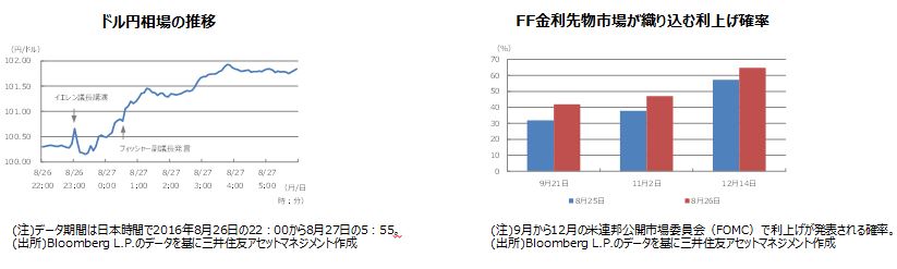 米連邦準備制度理事会(FRB)のイエレン議長は8月26日、米ワイオミング州ジャクソンホールにおける経済シンポジウムで講演を行い、「フェデラルファンド(FF)金利引き上げの論拠はこの数カ月で強まったと考えられる」と述べ、利上げに前向きな姿勢を示しました。またフィッシャー副議長はイエレン議長の講演後、米テレビ番組のインタビューで「9月あるいは年内2回の利上げを見込むべきか」と問われ、「イエレン議長の発言は、その質問の両方にイエスと答えることと整合的だ」と述べました。