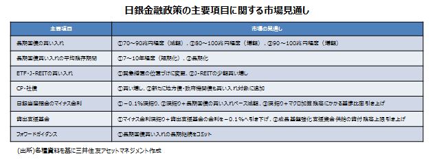 基本的な政策の枠組みについては、これまでの政策は効果があったという日銀の判断の下、大幅な修正は加えられないと思われます。物価目標については2%が維持される一方、達成時期は「できるだけ早期」などに修正される可能性があります。また検証結果の公表と同時に0.1%のマイナス金利の深掘りが行われると予想しますが、一部の見方にあるような、国債の買い入れに70~90兆円程度のレンジを付けることについては、レンジ下限での買い入れが量の縮小(テーパリング)を想起させ、円高や長期金利上昇につながる恐れがあり、その公算は小さいとみています。