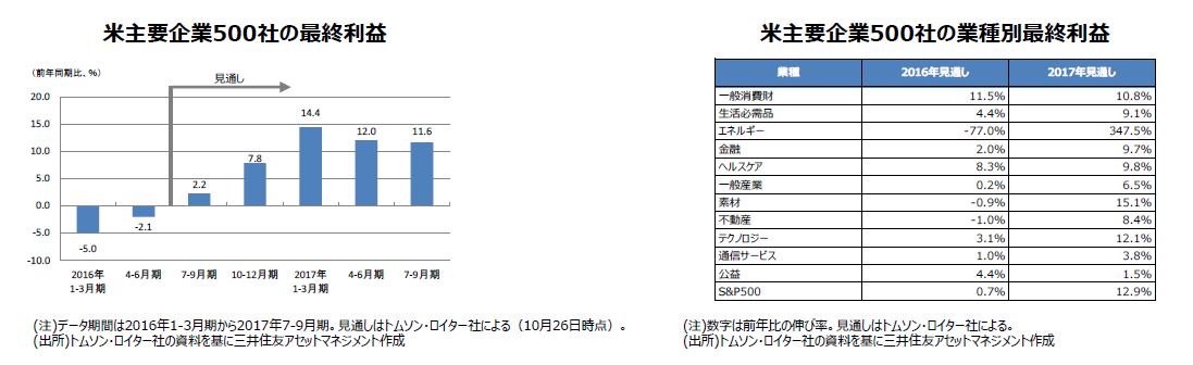 これまで7-9月期の最終利益は、前年同期比で小幅な減益が見込まれていましたが、11月1日時点では前年同期比で3.2%の増益見通しに転じています。7-9月期の決算は依然としてエネルギー企業の大幅減益が業種全体の重しになるとみられますが、10-12月期以降はその影響度合いが薄まると予想されます。また通年における最終利益の見通しも、2016年が前年比0.7%増、2017年は同12.9%増となっており、現時点では順調な利益の伸びが見込まれています。