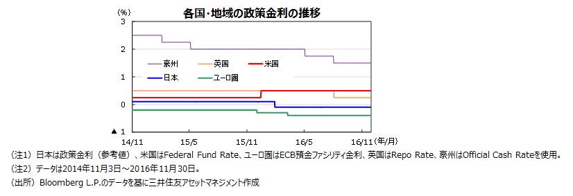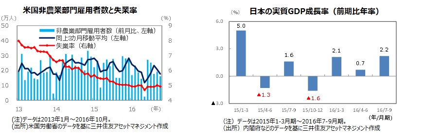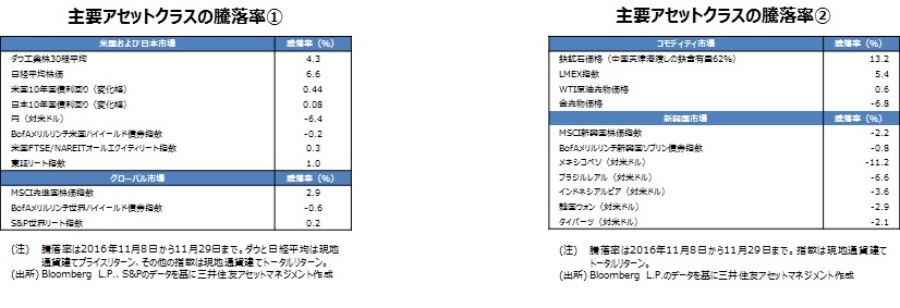 米大統領選挙では、大規模減税とインフラ投資を政策に掲げるトランプ候補が勝利しました。その結果、米国の景気拡大、物価上昇、利上げペース加速という見方が強まり、米国市場は素直に株高、債券安(利回りは上昇)、ドル高で反応しました。日本株は米国株の上昇や円安の進行で買い安心感が広がり、堅調に推移しました。また米インフラ投資への期待は総じてコモディティ市場の追い風となりました。一方、米長期金利の上昇でハイイールド債券が下落(利回りは上昇)し、多くの新興国ではドル高で相対的に通貨安が進行し、株式や債券が下落しました。