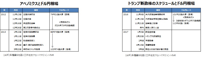 ドル円は11月9日に1ドル=101円20銭水準をつけた後に急反転し、11月25日には113円90銭水準をつけました。トランプ次期大統領の大規模減税やインフラ投資などが材料視され、3週間足らずで約10円のドル高・円安が進行したことになります。過去、アベノミクスへの「期待」で円安が進行しましたが、当時は約2カ月で9円58銭程度でした。両者のケースを単純に比較することはできませんが、今回はトランプ次期大統領の政策に対する「期待」が、短期間で急激にドル円相場に織り込まれた格好になっています。