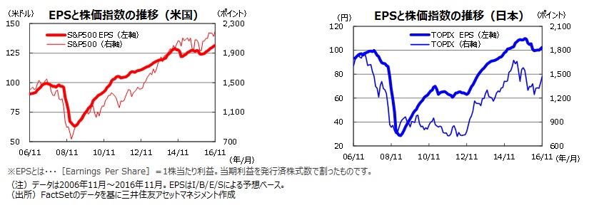 S&P500指数の16年7-9月期の1株当たり予想利益(EPS)は前年同期比+4.2%の増益(トムソンロイター12月1日発表ベース)となり、4-6月期を底に増益へと転換しました。続く10-12月期は同+6.2%、17年1-3月期は同+14.1%、17年4-6月期は同+11.9%、17年7-9月期同+9.8%と増益が見込まれています。一方、日本の東証株価指数(TOPIX)の予想EPSは16年6月に底をつけ、7月以降は改善傾向にあります。11月は102.35円と2カ月連続の上昇、4カ月連続の100円台維持となりました。