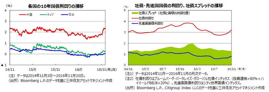日米欧の長期金利は上昇しました。米大統領選挙でトランプ氏が勝利し、上下院とも共和党が制した11月9日に10年国債利回りが大きく上昇し、今年1月下旬以来となる2%台に乗せました。トランプ氏の考える財政支出の拡大や減税が進むとの思惑が高まったことが背景です。金利はその後も上昇し、月末には2.367%となりました。欧州では、英国の10年国債の利回りが月間で0.18%上昇したほか、ドイツ10年国債の利回りも0.11%上昇しました。日本の10年国債利回りは10月末▲0.05%でしたが11月末は0.0198%とプラスに転じました。社債は、投資家の利回りへの需要が継続していることから、社債スプレッドはやや縮小しました。