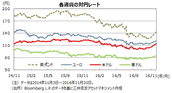 ドル円相場については、トランプ次期大統領の政策に対する期待が強く、日米長期金利差の拡大が見込まれることから、米ドル高・円安へと向かいやすい環境が当面続くと考えられます。ユーロ円相場については、低インフレを背景に、ECBが12月理事会で量的緩和を延長する可能性が高いため、ユーロは当面軟調な展開が見込まれます。また、英国のEU離脱選択に伴う不透明感から、英ポンドは当面下落圧力を受けやすい地合いが引き続き予想されます。