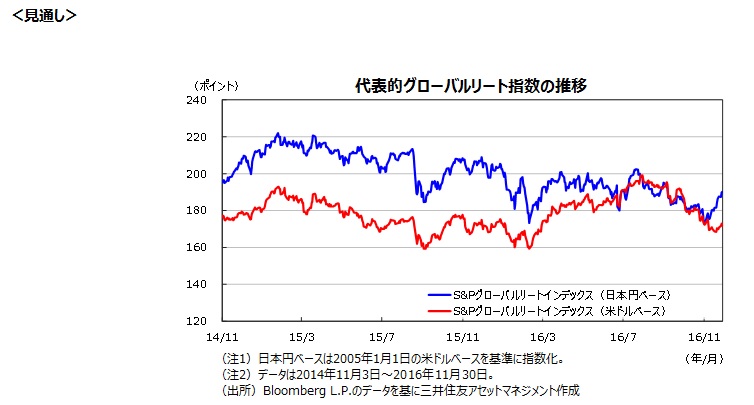 11月のリート市場は中旬にかけて調整色を強めましたが、その後は値を戻す展開となりました。上旬は、米大統領選挙後に長期金利が世界的に上昇し、リートと国債の利回り格差の縮小が嫌気されリートは調整しました。中旬は、17日にイエレン米連邦準備制度理事会(FRB)議長が議会証言で12月利上げの可能性を示唆したことから長期金利が上昇し、リート市場は軟調となりました。下旬は、トランプ次期大統領の経済対策に対する期待などから株式市場が堅調に推移し、10月の中古住宅販売件数が2007年2月以来の高水準となるなど、経済指標にも明るさが見えたことなどからリート市場は値を戻す展開となりました。S&Pグローバルリートインデックスの変動率は米ドルベースで▲6.2%、日本円ベースで▲2.7%でした。