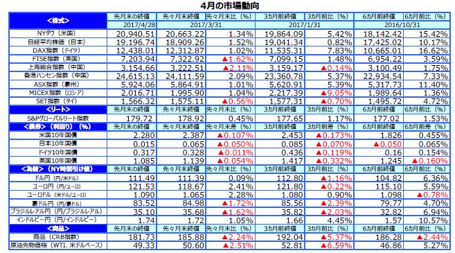 米国株式市場は、米軍によるシリア空爆や朝鮮半島情勢の悪化などの地政学リスクやフランス大統領選挙の混迷などが強く意識される展開となりました。ただ、下旬にかけては米国の金融規制の緩和や税制改革への期待の高まりなどから上昇に転じました。S&PやNYダウが堅調さを取り戻し、NASDAQ総合指数は史上最高値を更新しました。日本株式市場は、中旬にかけて108円/ドル台まで円高が進行し、日経平均株価が終値ベースで1万8,300円台まで下落しました。その後は、外部環境が落ち着き、ドル円レートが111円/ドルまで回復したことを受け、堅調さを取り戻しました。