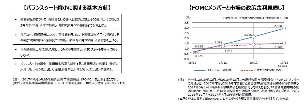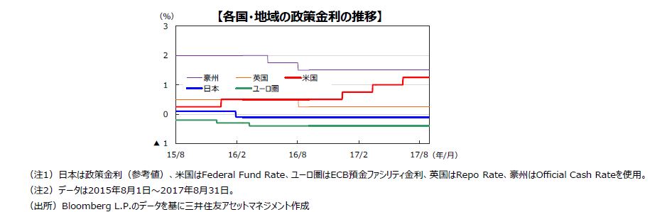 米国では、景気拡大が続くものの、インフレ率の低位安定が見込まれるため、今後の利上げは極めて緩やかなペースで行われると予想されます。FRBのバランスシート縮小も近く始まる見通しです。ただし、世界経済や金融市場に及ぼす影響等を勘案し、金融緩和の解除は緩やかに進めると考えられます。