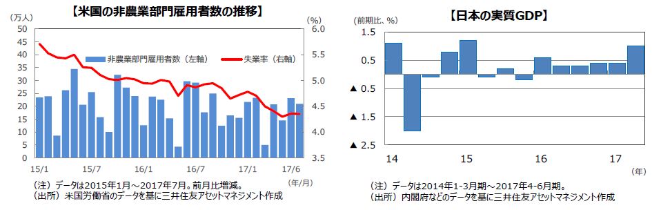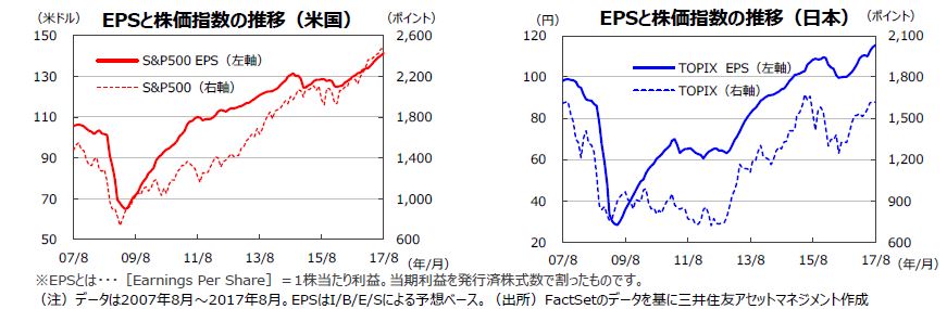 S&P500指数の17年8月の1株当たり予想利益(EPS)は141.26米ドル(前年同月比+8.8%)と11カ月連続で過去最高を更新しました。東証株価指数(TOPIX)の予想EPSは115.40円(同+15.4%)と、3カ月連続で二桁の伸びとなりました。