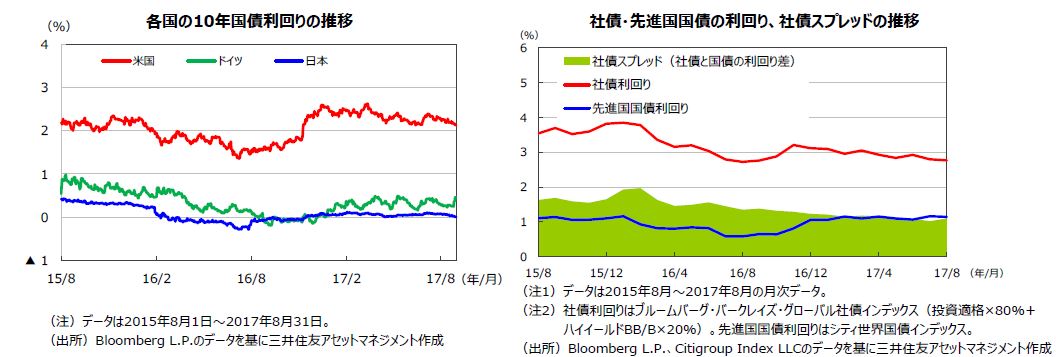 8月の米国10年国債利回りは、低下基調を辿りました。トランプ大統領の人種差別ともとれる発言やバノン大統領上級顧問の更迭、北朝鮮のミサイル発射等から政治的な不透明感が強まったこと、7月25~26日に開催された連邦公開市場委員会(FOMC)の議事要旨がハト派的と捉えられたこと等によるものです。ドイツ10年国債利回りは、ユーロ高を受け、低下しました。24~26日に開催された米カンザスシティ連銀主催のジャクソンホール経済会議では、イエレンFRB議長、ドラギECB総裁が講演を行いましたが、ともに金融政策の見通しや資産価格等への言及はありませんでした。月末の米国10年国債利回りは前月末比▲0.18%ポイントの2.12%、ドイツ10年国債利回りは同▲0.18%ポイントの0.36%、日本の10年国債利回りは同▲0.07%ポイントの0.01%でした。社債については、リスク回避の動きからやや軟調となり、国債とのスプレッドが拡大しました。